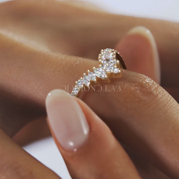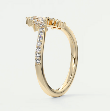 Regal curves and refined symmetry come together in the Valencia Round Chevron Wedding Band, a graceful arc of brilliance designed to complement and elevate any engagement ring. This luminous contour band features a graduated row of seven round brilliant diamonds, tapering in size toward the centre to create a soft, sculpted peak that hugs the setting of a solitaire or three-stone design.